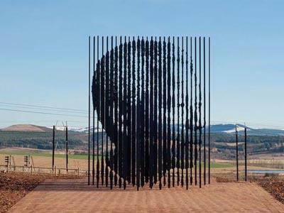 南非这件有南非国父之称的前总统纳尔逊·曼德拉的雕像,在2012年8月4日与南非人民见面。纪念其因反抗种族歧视而入狱50周年。这座雕像并未采用常见的大理石材质和写实手法,而是使用50根10米长的钢柱为媒材,钢柱的体面变化形成曼德拉头像,同时又指代监狱铁窗,由艺术家MarcoCianfanelli创作。