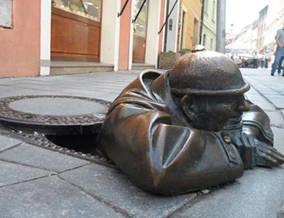 这件颇有趣味的街头雕塑,一不小心就会将走在街上的行人绊倒。画家Viktor Hulik在1997年完成了这件作品。他的“头”还被偷过两次,以至于到后来警察不得不列一个警示牌来保护他的“休息”。