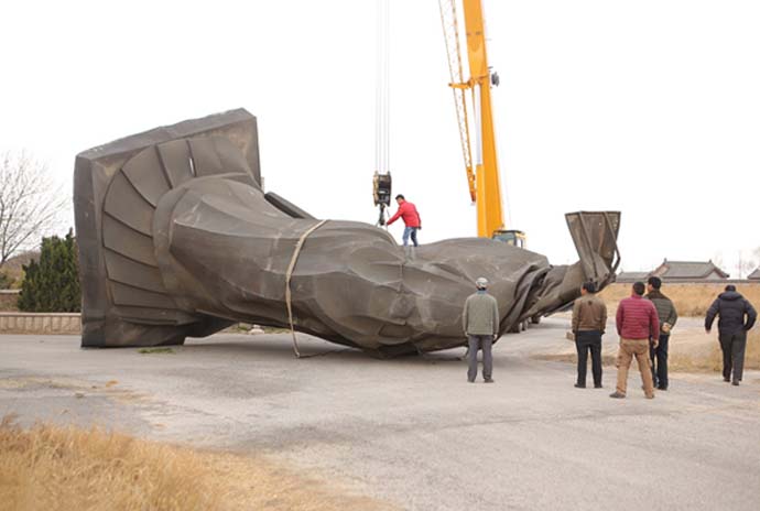 然而就在2018年4月6日这天,这尊重6吨、高约19米的巨型始皇帝塑像在上午十点左右被一阵7级瞬时大风刮倒并从高台上跌翻在地。被大风刮倒吹翻在地的秦始皇雕像,可看出雕像是用锻造工艺制作而成
